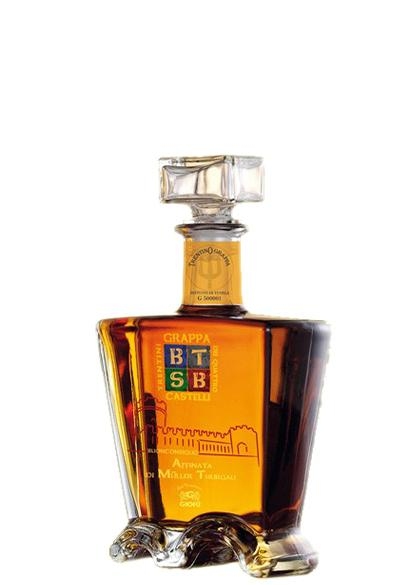 Linea grappa dei 4 castelli Trentini - Grappe da monovitigni trentini diversi, tipici del territorio ove il castello è sito. Affinate in barrique di legni diversi.. Grappa da monovitigno muller thurgau affinata in Legno di castagno. Gusto aromatico